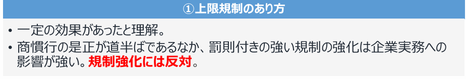 正直、ブラック企業は守る気もないので上限があろうがなかろうが守らないんでしょうが、コンプライアンスを気にする大企業は規制緩和を求めていますね。