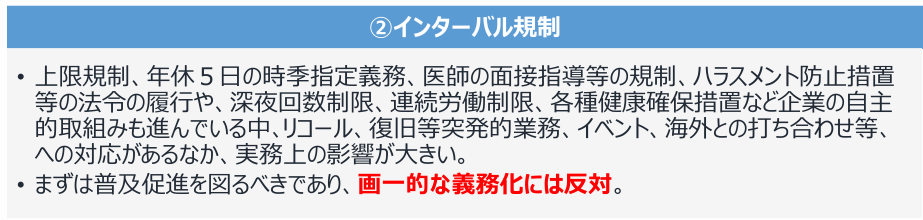 何か商習慣がどうとか、実務が云々と言っていますが、規制強化なんてトンでもない、インターバル規制に関してもルール化するなというのが本音でしょう。