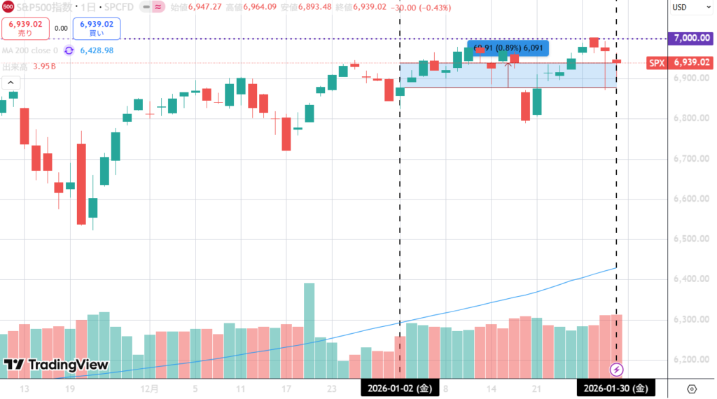 2026年1月のS&P500指数は月初初値6,878.11ポイント、終値が6,939.02ポイントのプラス60.91ポイント、前月比では1.37%の上昇でした。
