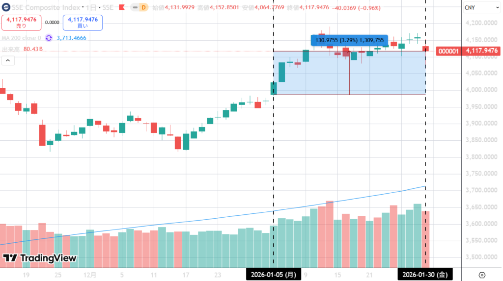2026年1月の上海総合指数は月初始値3,986.97ポイント、月末終値が4,117.94ポイントのプラス130.97ポイント、前月比では3.76%の上昇でした。