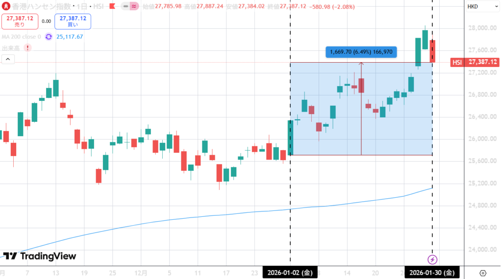2026年1月の香港ハンセン指数は始値25,717ポイント、終値27,387ポイントのプラス1,669ポイント、前月比6.85%の大幅上昇でした。