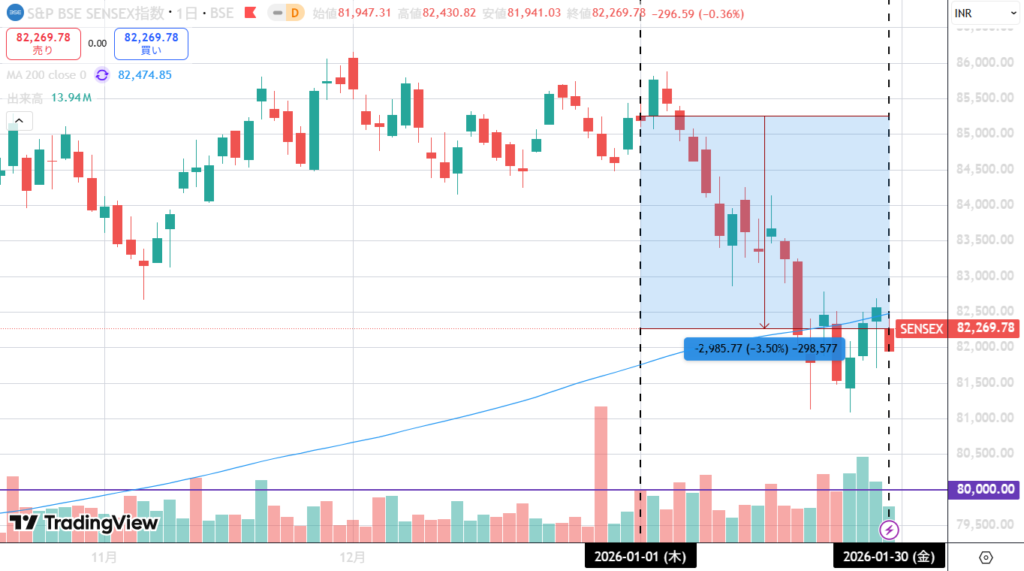 2026年1月のインドSENSEXは月初始値85,255ポイント、月末終値82,269ポイントのマイナス2,985ポイント、先月比3.46%の下落でした。
