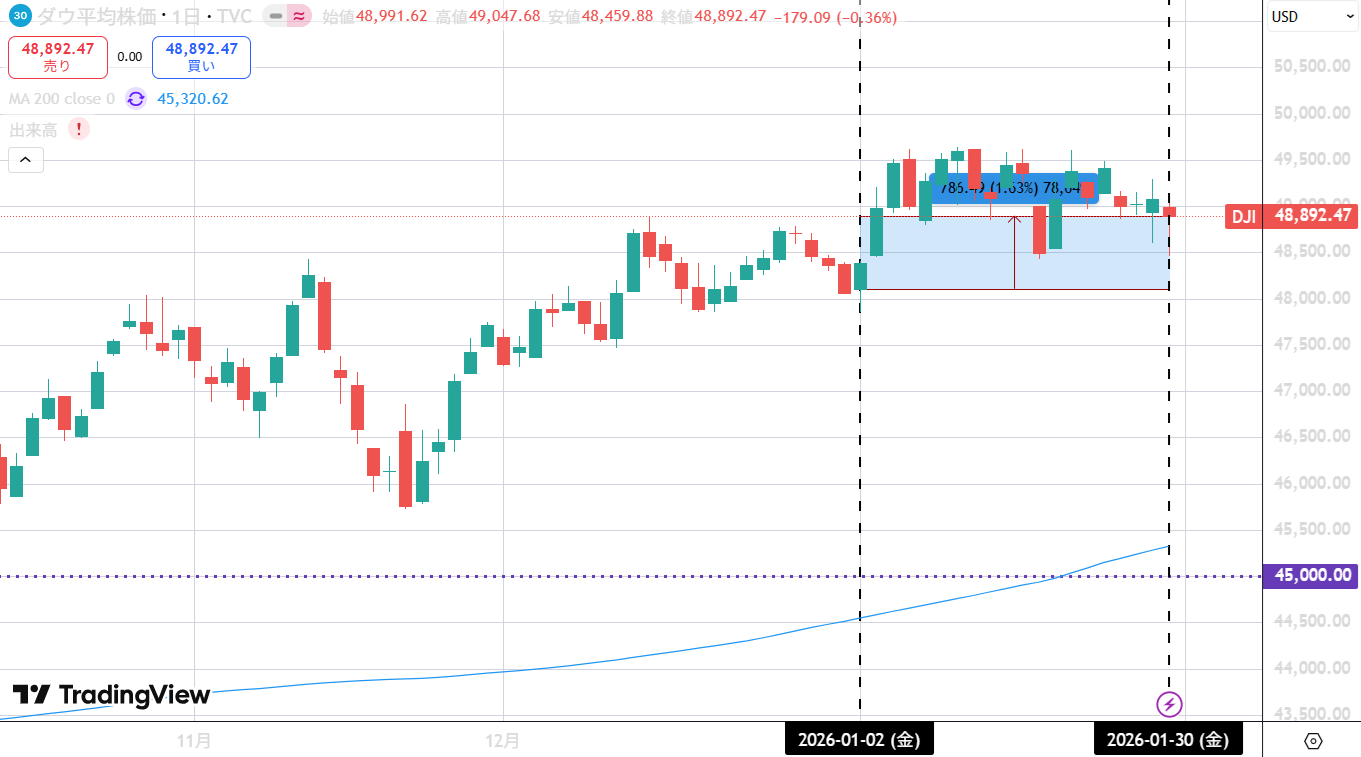 2026年1月のNYダウは月初始値48,105ドル、月末終値48,892ドルのプラス786ドル、先月比1.73%の上昇でした。