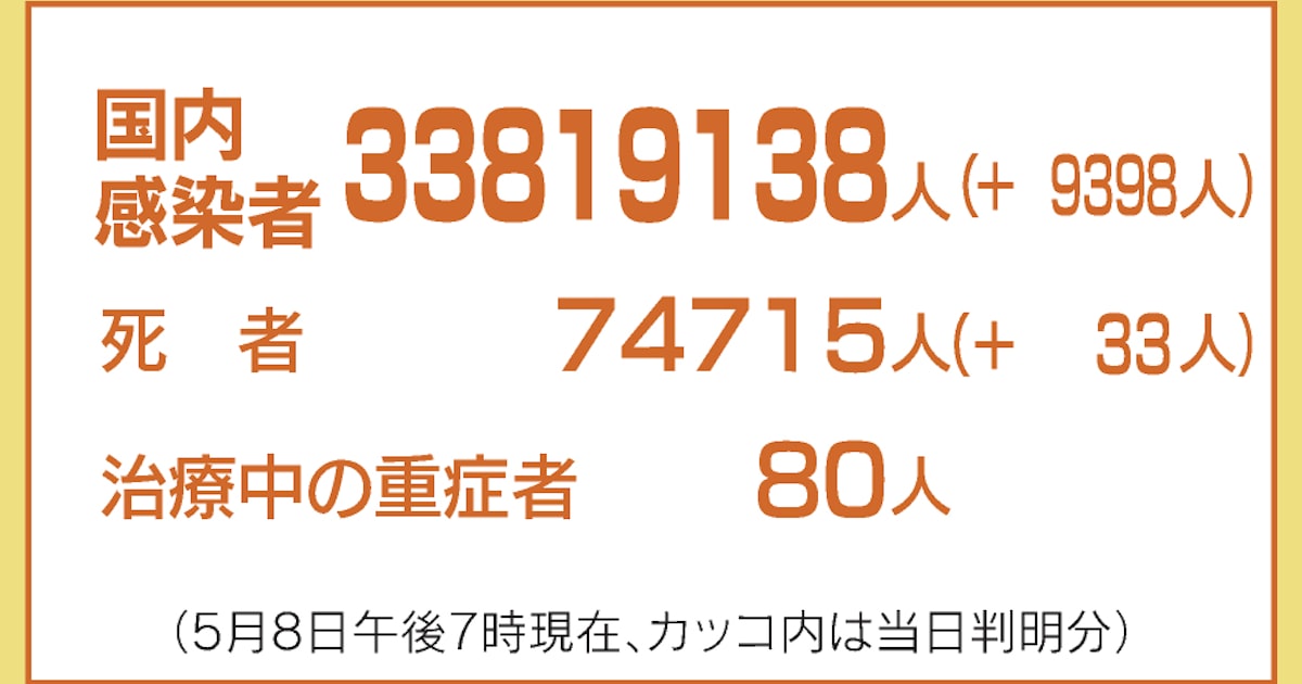 お断り 国内の新型コロナウイルスの感染状況は感染症法上の扱いが変わり、国・自治体が日々の感染者数を公表しないため毎日の更新を終了します。国内では8日、新型コロナウイルスの感染者が午後7時時点で新たに9398人確認された。感染者の累計は